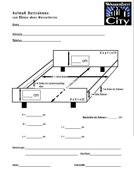 Sie wollen ein bestehendes Bettgestell in ein Wellness-Wasserbett verwandeln? Dann könnte unsere Bettrahmen-Aufmaß-Hilfe für Sie nützlich sein. Sie finden die PDF Datei hier zum Download.